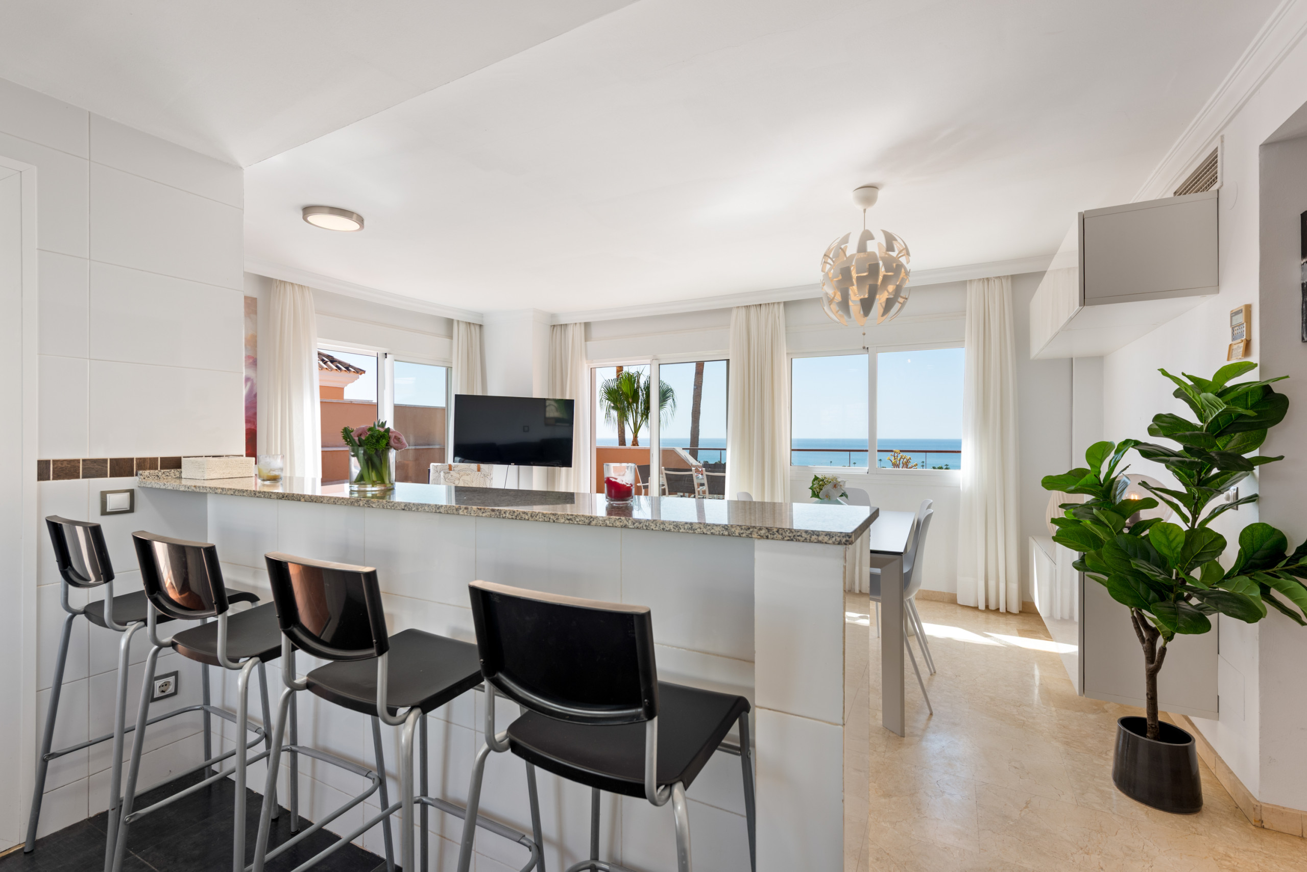 Gelegen op de bovenste verdieping van een charmante residentie met een gemeenschappelijk zwembad, beschikt de woning over twee privé-terrassen met meubilair, waarvan er één rechtstreeks is verbonden met de lichte woon-eetkamer en de moderne, volledig uitgeruste open keuken. Het tweede terras, een ruime en zonnige solariumruimte, is bereikbaar via een privétrap en belooft onvergetelijke momenten onder de Andalusische hemel.